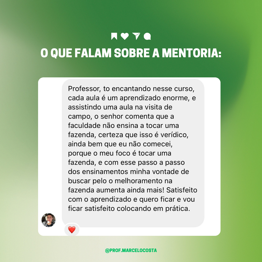 E agora, serei o seu mentor direto, o cara que pega você pela mão e leva onde você merece estar. Meu objetivo é mostrar pra você que é possível sim, transformar fazendas comuns em empresas altamente lucrativas sem grandes investimentos e sem despesas desnecessárias.